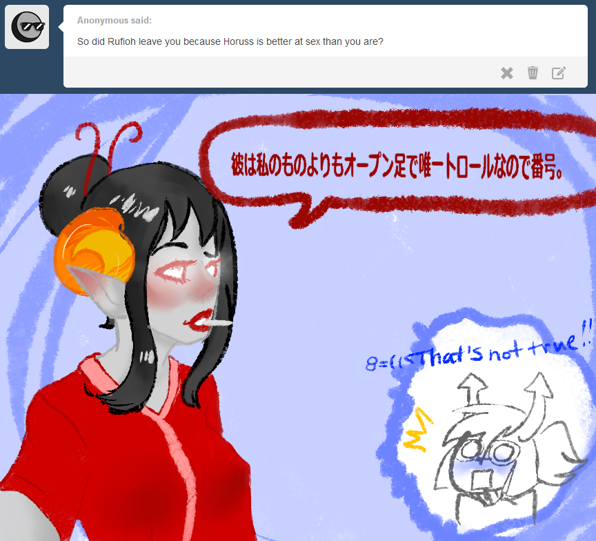ask blush damara_megido dancestors horuss_zahhak language:japanese smoking word_balloon