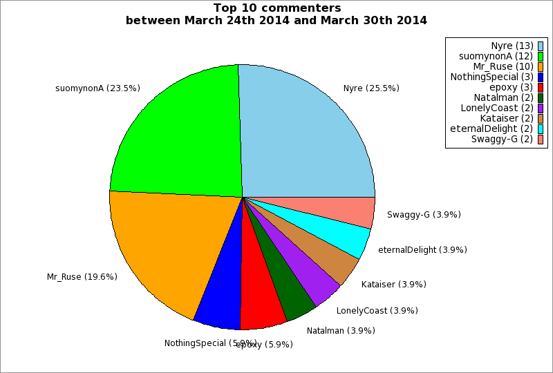 | Top 10 commenters between March 24th 2014 and March 30th 2014 | ||
