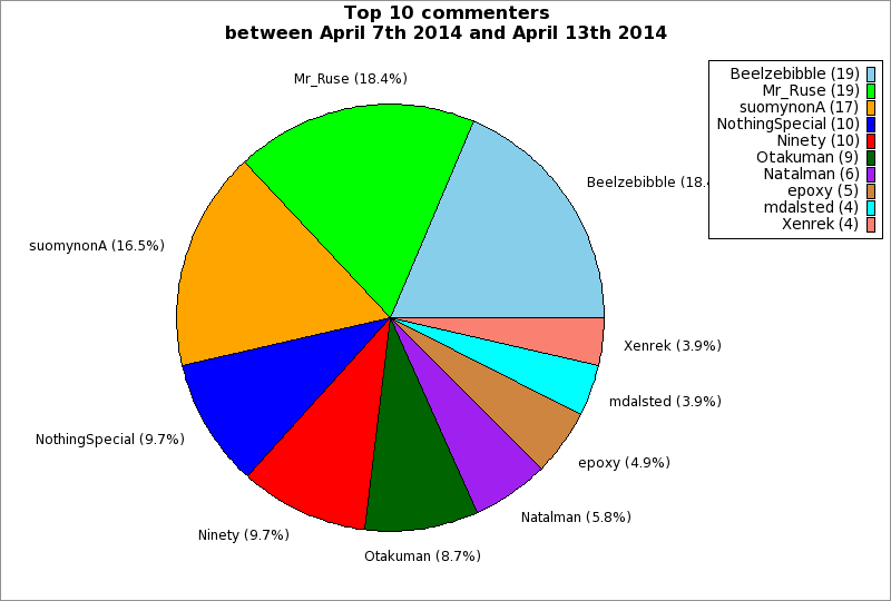 | Top 10 commenters between April 7th 2014 and April 13th 2014 | ||