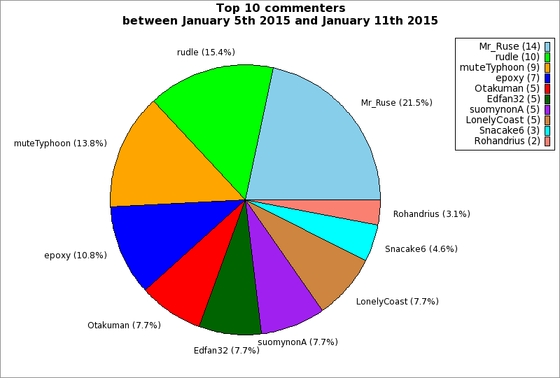| Top 10 commenters between January 5th 2015 and January 11th 2015 | ||