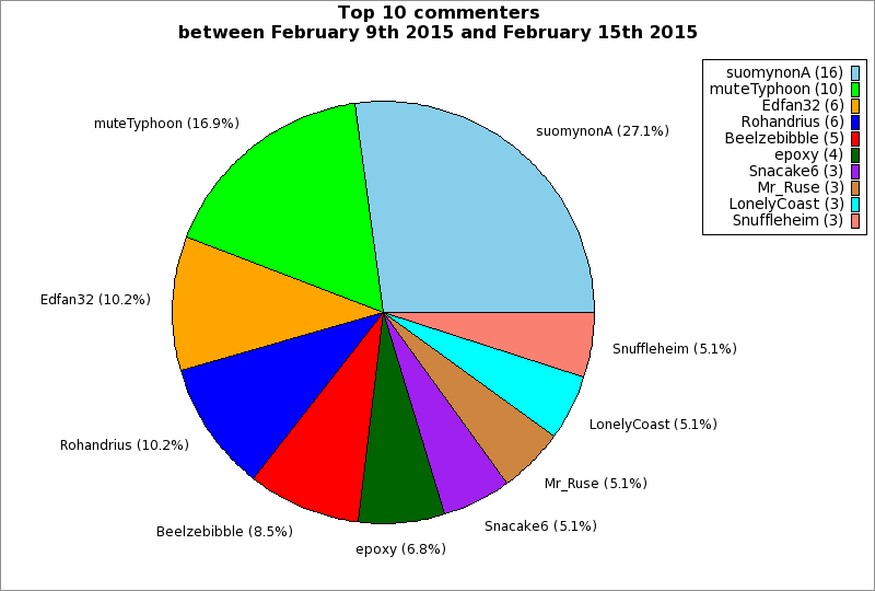 | Top 10 commenters between February 9th 2015 and February 15th 2015 | ||