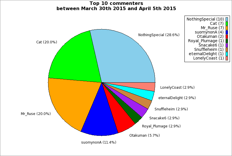 | Top 10 commenters between March 30th 2015 and April 5th 2015 | ||