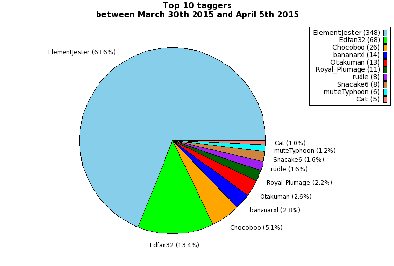 | Top 10 taggers between March 30th 2015 and April 5th 2015 | ||
