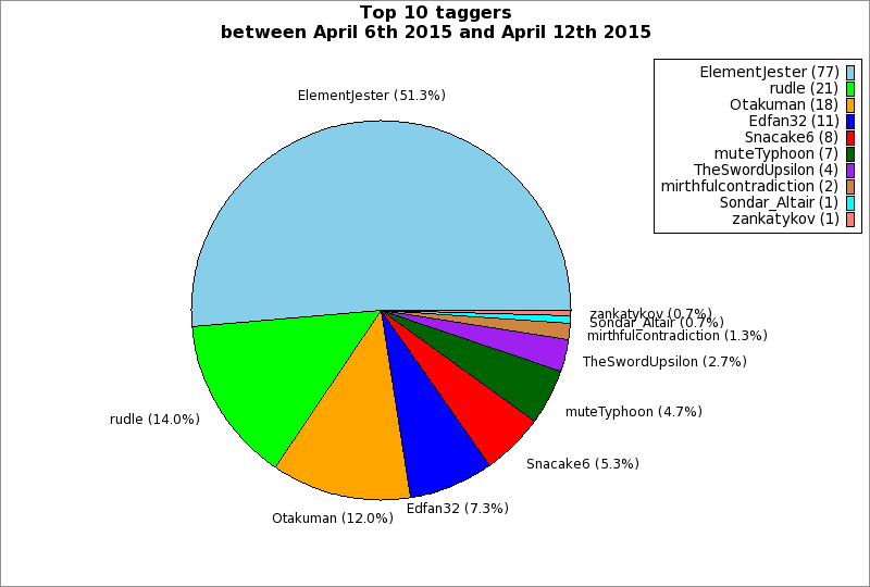 | Top 10 taggers between April 6th 2015 and April 12th 2015 | ||