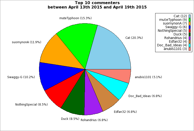 | Top 10 commenters between April 13th 2015 and April 19th 2015 | ||