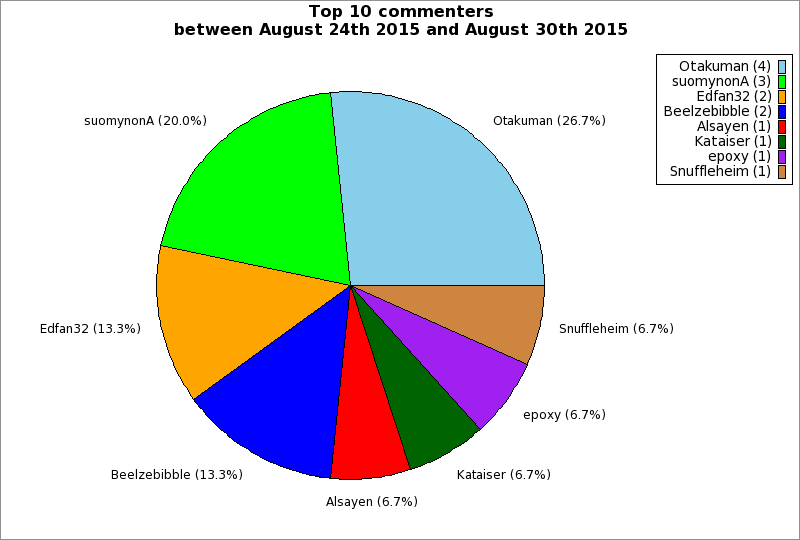| Top 10 commenters between August 24th 2015 and August 30th 2015 | ||