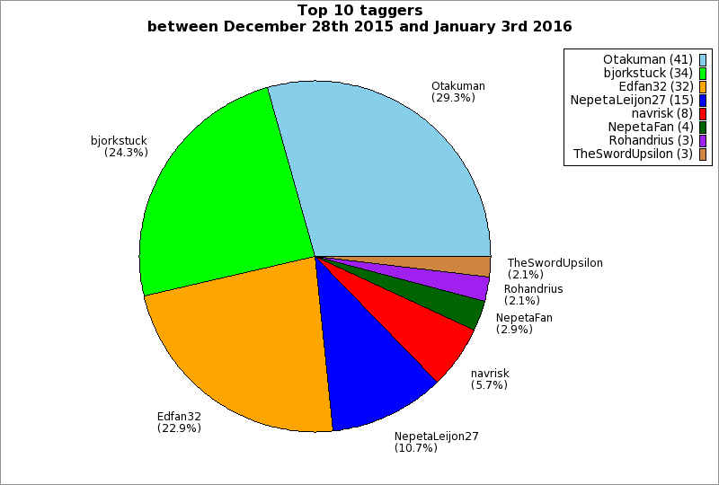 | Top 10 taggers between December 28th 2015 and January 3rd 2016 | ||