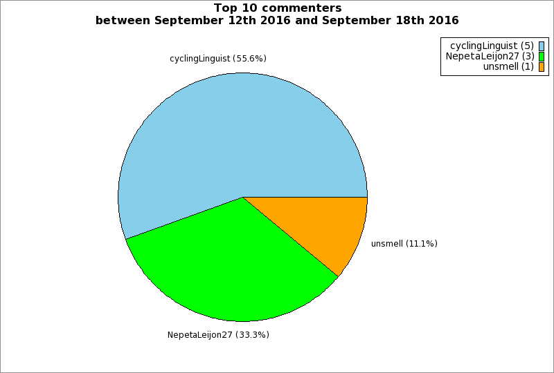 | Top 10 commenters between September 12th 2016 and September 18th 2016 | ||