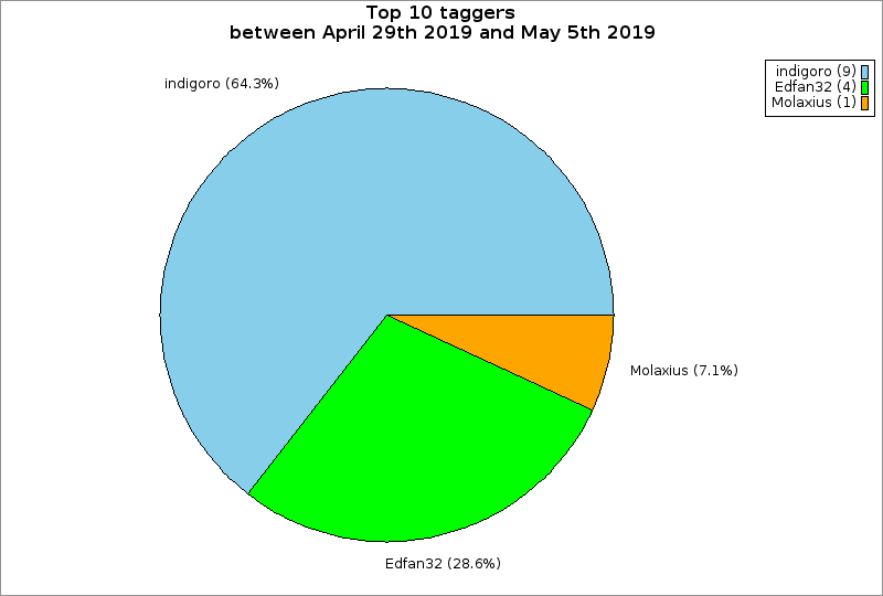 | Top 10 taggers between April 29th 2019 and May 5th 2019 | ||